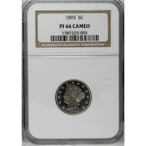 <B>1893<5C> PR66 Cameo NGC.</B></I> Nicely frosted design elements offer a pronounced contrast with the deeply reflective fields. This Gem proof is virtually free of hairlines or other blemishes. Census: 20 in 66, 4 finer (5/06).