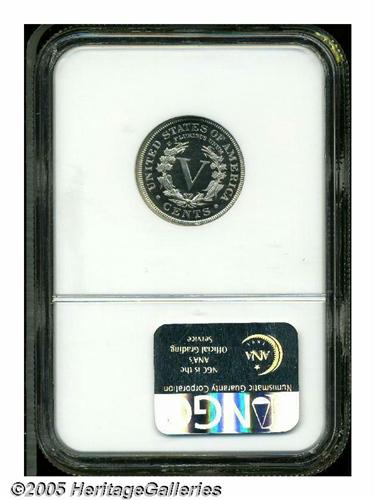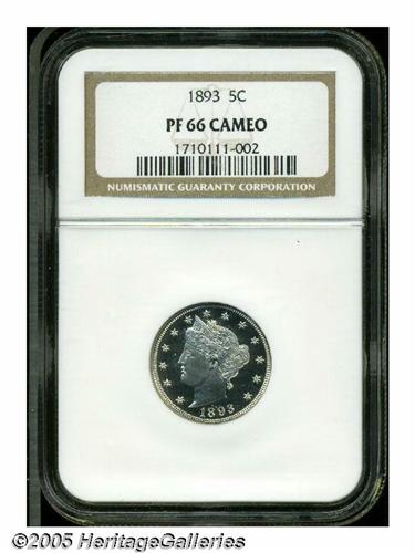 <B>1893<5C> PR66 Cameo NGC.</B></I> Sharply struck with deeply mirrored, jet-black fields, and beautifully contrasted, richly frosted devices. A visually stunning premium Gem proof, with immaculately preserved surfaces. Population: 18 in 66, 4 finer (6/05).