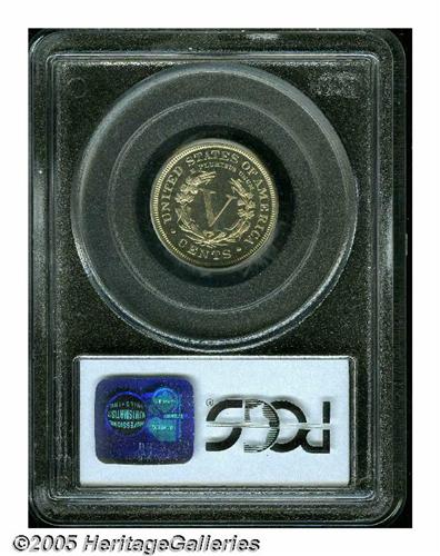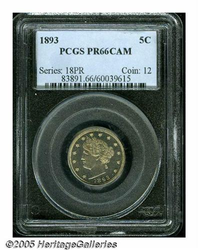 <B>1893<5C> PR66 Cameo PCGS.</B></I> Dappled golden iridescence drifts over bright, mostly glassy surfaces. There is, however, some light mint frost over the devices of this appreciably cameoed Gem. Population: 8 in 66 Cameo, 7 finer with this finish (3/05).
