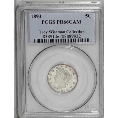 <B>1893<5C> PR66 Cameo PCGS.</B></I> A deeply reflective and boldly impressed champagne-toned proof. The fields and devices offer nice contrast. Population: 11 in 66 Cameo, 7 finer (8/06).<BR><I>From The Troy Wiseman Collection.</B></I>