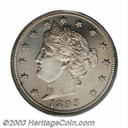 <TR><TD width="100%"><TABLE cellSpacing=1 cellPadding=3 width="100%" border=0><TBODY><TR><TD width="100%" bgColor=#79735c><FONT face=arial color=#ffffff size=3><B>Description</B> </FONT></TD></TR><TR><TD width="100%" bgColor=#ffffff><FONT face=arial size=2><B>1893 5C PR66 Cameo PCGS.</B></I> Deeply mirrored in the fields with slight contrast visible as a result of light frost on the devices. The otherwise brilliant surfaces show just a bit of pale golden peripheral color on the obverse, while the reverse displays light streakiness of the same color. Population: 4 in 66, 2 finer (4/03). </FONT></TD></TR></TBODY></TABLE></TD></TR></TBODY></TABLE><BR><A name=PricesRealized></A><TABLE cellSpacing=0 cellPadding=0 width="100%" bgColor=#000000 border=0><TBODY><TR><TD width="100%"><TABLE cellSpacing=1 cellPadding=3 width="100%" border=0><TBODY><TR><TD width="100%" bgColor=#79735c><A name=PR><FONT face=arial color=#ffffff size=3><B>Previous Prices from Heritage Auctions</B> </FONT></A></TD></TR><TR><TD bgColor=#f6f6ed><TABLE cellSpacing=0 cellPadding=0 width="100%" border=1><TBODY><TR><TD align=middle width="33%"><B>Date</B></TD><TD align=middle width="33%"><B>Service</B></TD><TD align=middle width="33%"><B>Price</B></TD></TR><TR bgColor=whitesmoke><TD width="33%"><B>01/11/2003</B></TD><TD width="33%">PCGS</TD><TD width="33%">$2,645.00</TD></TR><TR bgColor=whitesmoke><TD width="33%"><B>09/28/2002</B></TD><TD width="33%">PCGS</TD><TD width="33%">$1,955.00</TD></TR><TR bgColor=whitesmoke><TD width="33%"><B>11/15/2001</B></TD><TD width="33%">PCGS</TD><TD width="33%">$902.75</TD></TR></TBODY></TABLE></TD></TR><TR><TD bgColor=#ffffff><FONT face=arial size=1 ?>PLEASE NOTE: All prices realized reflect the final hammer price PLUS the buyer's premium in auctions that charge a buyer's premium. Each item has a notation at the top of the listing indicating whether that lot included a buyer's premium. Example: A item that sells with a final hammer price of $100 and a 20% buyer's premium will display with a price realized of $120. All information listed is intended to be as accurate as possible, but errors are possible. Please use this guide carefully and inform us of any inaccuracies. </FONT></TD></TR></TBODY></TABLE></TD></TR></TBODY></TABLE><BR><TABLE cellSpacing=0 cellPadding=0 width="100%" bgColor=#000000 border=0><TBODY><TR><TD width="100%"><TABLE cellSpacing=1 cellPadding=3 width="100%" border=0><TBODY><TR><TD width="100%" bgColor=#79735c colSpan=6><FONT face=arial color=#ffffff size=3><B>Price Guide*</B> </FONT></TD></TR><TR bgColor=#f6f6ed><TD align=middle><B>Grade</B> </TD><TD align=middle><B>Coin World<BR>(Trends)</B> </TD><TD align=middle><B>Numismedia<BR>Retail</B> </TD><TD align=middle><B>Numismedia<BR>Wholesale</B> </TD><TD align=middle><B>Coin<BR>Universe</B> </TD><TD align=middle><B>Heritage<BR>Value Index</B> </TD></TR><TR bgColor=#ffffff><TD align=middle>65</TD><TD align=right>---</TD><TD align=right>---</TD><TD align=right>---</TD><TD align=right>---</TD><TD align=right>$390.25</TD></TR><TR style="FONT-WEIGHT: bold" bgColor=#cccfdd><TD align=middle>66</TD><TD align=right>---</TD><TD align=right>---</TD><TD align=right>---</TD><TD align=right>---</TD><TD align=right>---</TD></TR><TR bgColor=#ffffff><TD align=middle>67</TD><TD align=right>---</TD><TD align=right>---</TD><TD align=right>---</TD><TD align=right>---</TD><TD align=right>---</TD></TR><TR bgColor=#ffffff><TD colSpan=6><FONT size=1>*All information listed is intended to be as accurate as possible, but errors are possible. No item may be returned or refused based on this information which is provided as a service to our customers. You should contact each pricing source directly to determine the accuracy of this information. </FONT></TD></TR></TBODY></TABLE></TD></TR></TBODY></TABLE><BR><TABLE cellSpacing=0 cellPadding=0 width="100%" bgColor=#000000 border=0><TBODY><TR><TD width="100%"><TABLE cellSpacing=1 cellPadding=3 width="100%" border=0><TBODY><TR><TD width="100%" bgColor=#79735c><FONT face=arial color=#ffffff size=3><B>Population Guide</B> </FONT></TD></TR><TR bgColor=#ffffff><TD align=middle><!-- Begin Output of Population Grid--><TABLE cellSpacing=0 cellPadding=0 width="100%" border=0><TBODY><TR><TD vAlign=center><TABLE cellSpacing=0 width="100%" border=1 cellsadding="3"><TBODY><TR><TD vAlign=center><TABLE cellSpacing=0 cellPadding=3 width="100%" border=1><TBODY><TR><TD vAlign=center align=middle bgColor=#f0f1e8 colSpan=2 <CENTER><FONT face=Arial size=2><B>PCGS Pop </B></FONT><CENTER></CENTER></TD><TD vAlign=center align=middle bgColor=#f0f1e8 colSpan=2><CENTER><FONT face=Arial size=2><B>NGC Pop</B></CENTER></FONT></TD></TR><TR><TD vAlign=center><FONT face=Arial size=2>(66)</FONT> </TD><TD vAlign=center align=right><FONT face=Arial size=2>4</FONT> </TD><TD vAlign=center><FONT face=Arial size=2>(66)</FONT> </TD><TD vAlign=center align=right><FONT face=Arial size=2>10</FONT> </TD></TR><TR><TD vAlign=center><FONT face=Arial size=2>(>66)</FONT> </TD><TD vAlign=center align=right><FONT face=Arial size=2>2</FONT> </TD><TD vAlign=center><FONT face=Arial size=2>(>66)</FONT> </TD><TD vAlign=center align=right><FONT face=Arial size=2>4</FONT> </TD></TR></TBODY></TABLE></TD></TR></TBODY></TABLE></TD></TR></TBODY></TABLE><!-- End Output of Population Grid--></TD></TR></TBODY></TABLE></TD></TR></TBODY></TABLE><BR><TABLE cellSpacing=0 cellPadding=0 width="100%" bgColor=#000000 border=0><TBODY><TR> Important notice: We expect to be auctioning lots at the rate of 200-250 per hour. On occasion eBay live bid software cannot keep up with the pace of the auctions where 4-5 lots per minute can hammer down, so we recommend that you place a realistic absentee bid now as insurance to avoid disappointment. Also please note that all Heritage/CAA lots purchased through eBay Live carry a 20% Buyer's Premium. Please make sure you read the Terms and Conditions.