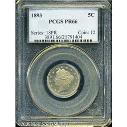 <B>1893 5C PR66 PCGS.</B></I> Light champagne-gold patina is imbued with faint rainbow undertones. The surfaces have been lovingly preserved. Population: 23 in 66, 0 finer (1/05). Lot:5922