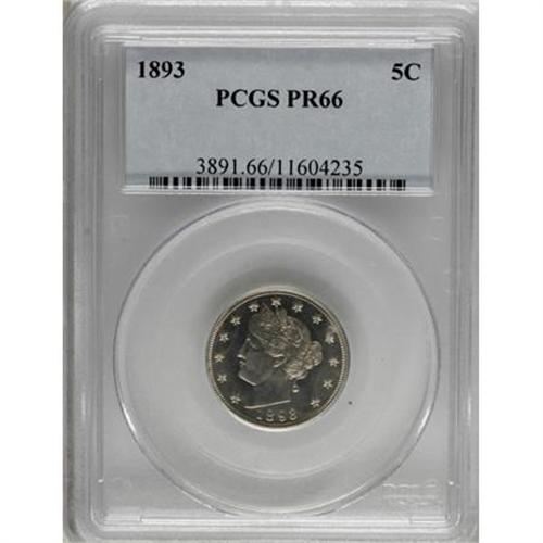 <B>1893 5C PR66 PCGS.</B></I> A flashy champagne-toned representative that offers great detail and powerful visual appeal. With 2,195 pieces struck, the 1893 has a low proof mintage compared to the preceding years. Population: 24 in 66, 0 finer (7/07).<BR><BR><B>Coin Engraver:</B> Charles E. Barber<BR><BR><b>Shipping:</b> Coins & Currency (<a target="_blank" href="http://www.heritageauctions.com/common/shipping.php">view shipping information</a>\)