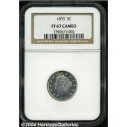 <table><tbody><tr><td><table> <TR><TD width="100%"><TABLE cellSpacing=1 cellPadding=3 width="100%" border=0><TBODY><TR><TD width="100%" bgColor=#79735c><FONT face=arial color=#ffffff size=3><B>Description</B> </FONT></TD></TR><TR><TD width="100%" bgColor=#ffffff><FONT face=arial size=2><B>1893 5C PR67 Cameo NGC.</B></I> Deeply mirrored in the fields with modest but noticeable mint frost on the devices. Each side has subtle pastel iridescence with slightly deeper golden toning scattered around the margins. An exquisite proof Liberty nickel. Population: 3 in 67, 0 finer (11/03). </FONT></TD></TR></TBODY></TABLE></TD></TR></TBODY></TABLE><BR><A name=PricesRealized></A><TABLE cellSpacing=0 cellPadding=0 width="100%" bgColor=#000000 border=0><TBODY><TR><TD width="100%"><TABLE cellSpacing=1 cellPadding=3 width="100%" border=0><TBODY><TR><TD width="100%" bgColor=#79735c><A name=PR><FONT face=arial color=#ffffff size=3><B>Previous Prices from Heritage Auctions</B> </FONT></A></TD></TR><TR><TD bgColor=#f6f6ed><TABLE cellSpacing=0 cellPadding=0 width="100%" border=1><TBODY><TR><TD align=middle width="33%"><B>Date</B></TD><TD align=middle width="33%"><B>Service</B></TD><TD align=middle width="33%"><B>Price</B></TD></TR><TR bgColor=whitesmoke><TD width="33%"><B>09/20/2003</B></TD><TD width="33%">PCGS</TD><TD width="33%">$4,600.00</TD></TR><TR bgColor=whitesmoke><TD width="33%"><B>03/01/2003</B></TD><TD width="33%">NGC</TD><TD width="33%">$3,680.00</TD></TR></TBODY></TABLE></TD></TR><TR><TD bgColor=#ffffff><FONT face=arial size=1 ?>PLEASE NOTE: All prices realized reflect the final hammer price PLUS the buyer's premium in auctions that charge a buyer's premium. Each item has a notation at the top of the listing indicating whether that lot included a buyer's premium. Example: A item that sells with a final hammer price of $100 and a 20% buyer's premium will display with a price realized of $120. All information listed is intended to be as accurate as possible, but errors are possible. Please use this guide carefully and inform us of any inaccuracies. </FONT></TD></TR></TBODY></TABLE></TD></TR></TBODY></TABLE><BR><TABLE cellSpacing=0 cellPadding=0 width="100%" bgColor=#000000 border=0><TBODY><TR><TD width="100%"><TABLE cellSpacing=1 cellPadding=3 width="100%" border=0><TBODY><TR><TD width="100%" bgColor=#79735c colSpan=6><FONT face=arial color=#ffffff size=3><B>Price Guide*</B> </FONT></TD></TR><TR bgColor=#f6f6ed><TD align=middle><B>Grade</B> </TD><TD align=middle><B>Coin World<BR>(Trends)</B> </TD><TD align=middle><B>Numismedia<BR>Retail</B> </TD><TD align=middle><B>Numismedia<BR>Wholesale</B> </TD><TD align=middle><B>Coin<BR>Universe</B> </TD><TD align=middle><B>Heritage<BR>Value Index</B> </TD></TR><TR bgColor=#ffffff><TD align=middle>66</TD><TD align=right>---</TD><TD align=right>---</TD><TD align=right>---</TD><TD align=right>---</TD><TD align=right>---</TD></TR><TR style="FONT-WEIGHT: bold" bgColor=#cccfdd><TD align=middle>67</TD><TD align=right>---</TD><TD align=right>---</TD><TD align=right>---</TD><TD align=right>---</TD><TD align=right>---</TD></TR><TR bgColor=#ffffff><TD align=middle>68</TD><TD align=right>---</TD><TD align=right>---</TD><TD align=right>---</TD><TD align=right>---</TD><TD align=right>---</TD></TR><TR bgColor=#ffffff><TD colSpan=6><FONT size=1>*All information listed is intended to be as accurate as possible, but errors are possible. No item may be returned or refused based on this information which is provided as a service to our customers. You should contact each pricing source directly to determine the accuracy of this information. </FONT></TD></TR></TBODY></TABLE></TD></TR></TBODY></TABLE><BR><TABLE cellSpacing=0 cellPadding=0 width="100%" bgColor=#000000 border=0><TBODY><TR><TD width="100%"><TABLE cellSpacing=1 cellPadding=3 width="100%" border=0><TBODY><TR><TD width="100%" bgColor=#79735c><FONT face=arial color=#ffffff size=3><B>Population Guide</B> </FONT></TD></TR><TR bgColor=#ffffff><TD align=middle><!-- Begin Output of Population Grid--><TABLE cellSpacing=0 cellPadding=0 width="100%" border=0><TBODY><TR><TD vAlign=center><TABLE cellSpacing=0 width="100%" border=1 cellsadding="3"><TBODY><TR><TD vAlign=center><TABLE cellSpacing=0 cellPadding=3 width="100%" border=1><TBODY><TR><TD vAlign=center align=middle bgColor=#f0f1e8 colSpan=2 <CENTER><FONT face=Arial size=2><B>PCGS Pop </B></FONT><CENTER></CENTER></TD><TD vAlign=center align=middle bgColor=#f0f1e8 colSpan=2><CENTER><FONT face=Arial size=2><B>NGC Pop</B></CENTER></FONT></TD></TR><TR><TD vAlign=center><FONT face=Arial size=2>(67)</FONT> </TD><TD vAlign=center align=right><FONT face=Arial size=2>6</FONT> </TD><TD vAlign=center><FONT face=Arial size=2>(67)</FONT> </TD><TD vAlign=center align=right><FONT face=Arial size=2>3</FONT> </TD></TR><TR><TD vAlign=center><FONT face=Arial size=2>(>67)</FONT> </TD><TD vAlign=center align=right><FONT face=Arial size=2>0</FONT> </TD><TD vAlign=center><FONT face=Arial size=2>(>67)</FONT> </TD><TD vAlign=center align=right><FONT face=Arial size=2>0</FONT> </TD></TR></TBODY></TABLE></TD></TR></TBODY></TABLE></TD></TR></TBODY></TABLE><!-- End Output of Population Grid--></TD></TR></TBODY></TABLE></TD></TR></TBODY></TABLE><BR><TABLE cellSpacing=0 cellPadding=0 width="100%" bgColor=#000000 border=0><TBODY><TR> <font color='#000000'><span style='background-color: #FFFFFF'><td bgcolor='#FFFFFE'> Important notice: Heritage usually auctions material at the rate of 200-250 lots per hour. On some occasions eBay Live bid software or the Internet may not be able to keep up with the pace of the auction. We recommend placing a realistic absentee bid now as insurance to avoid disappointment. Occasionally the auctioneer may eliminate or reject an eBay Live bid, and the auctioneer may also reopen a lot after the close of the eBay live bidding (usually because we missed an audience bid), and may reject your bid even if it shows you as the winning bidder. By bidding via eBay Live, you agree that Her