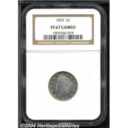<B>1893<5C> PR67 Cameo NGC.</B></I> Mildly contrasted between the fields and devices, this Superb Gem proof showcases beautiful iridescent rainbow patination atop boldly defined devices. While mention of flaws on the surfaces hardly seems fair because of the coin's near-pristine appearance, miniscule contact marks are located behind Liberty's head and in front of the eye. Scarcely encountered with the Cameo designation. Population: 5 in 67, 0 finer (7/04). <BR><BR><B>Important notice:</B> Heritage usually auctions material at the rate of 200-250 lots per hour. On some occasions eBay Live bid software or the Internet may not be able to keep up with the pace of the auction. We recommend placing a realistic absentee bid now as insurance to avoid disappointment. Occasionally the auctioneer may eliminate or reject an eBay Live bid, and the auctioneer may also reopen a lot after the close of the eBay live bidding (usually because we missed an audience bid), and may reject your bid even if it shows you as the winning bidder. By bidding via eBay Live, you agree that Heritage may award the lot to another bidder at its sole discretion under the circumstances described above or any other reasonable circumstances. Since eBay bids are not shown to us until we open the lot on the floor, we treat those bids just like floor bids. In most cases the floor responds before the eBay bid is presented to us, due to Internet lag time, so for consistency we have made it a policy that floor bids are always considered first over tie eBay live bids. Also please note that all Heritage lots purchased through eBay Live carry a 20% Buyer's Premium. Please make sure you read the Terms and Conditions before you bid. </span></font></tr></table></td></tr></table>