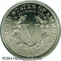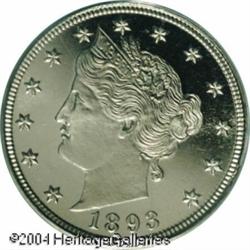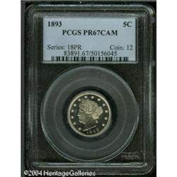1893 5C PR67 Cameo PCGS. This Superb proof has exc <B>1893 5C PR67 Cameo PCGS.</B></I> This Superb proof has excellent Cameo contrast with deeply mirrored chromium-like surfaces and deeply frosted devices. This example is tied with six others for finest certified by PCGS (10/04). <BR><BR><B>Important notice:</B> Heritage usually auctions material at the rate of 200-250 lots per hour. On some occasions eBay Live bid software or the Internet may not be able to keep up with the pace of the auction. We recommend placing a realistic absentee bid now as insurance to avoid disappointment. Occasionally the auctioneer may eliminate or reject an eBay Live bid, and the auctioneer may also reopen a lot after the close of the eBay live bidding (usually because we missed an audience bid), and may reject your bid even if it shows you as the winning bidder. By bidding via eBay Live, you agree that Heritage may award the lot to another bidder at its sole discretion under the circumstances described above or any other reasonable circumstances. Since eBay bids are not shown to us until we open the lot on the floor, we treat those bids just like floor bids. In most cases the floor responds before the eBay bid is presented to us, due to Internet lag time, so for consistency we have made it a policy that floor bids are always considered first over tie eBay live bids. Also please note that all Heritage lots purchased through eBay Live carry a 20% Buyer's Premium. Please make sure you read the Terms and Conditions before you bid. This lot is being auctioned in conjunction with a live floor auction by Heritage Galleries & Auctioneers. All final auction and invoice information will be supplied by Heritage Galleries & Auctioneers, and all other information should be considered preliminary. Lot:5548
