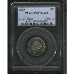 <TABLE cellSpacing=0 cellPadding=0 width="100%" bgColor=#000000 border=0><TBODY><TR><TD width="100%"><TABLE cellSpacing=1 cellPadding=3 width="100%" border=0><TBODY><TR><TD width="100%" bgColor=#79735c><FONT face=arial color=#ffffff size=3><B>Description</B> </FONT></TD></TR><TR><TD width="100%" bgColor=#ffffff><FONT face=arial size=2><B>1893 5C PR67 Cameo PCGS.</B></I> An incredibly eye appealing proof representative that is framed in multicolored pastel toning and boasts stark field-to-device contrast. Spectacular quality in a proof Liberty Nickel. </FONT></TD></TR></TBODY></TABLE></TD></TR></TBODY></TABLE><BR><A name=PricesRealized></A><TABLE cellSpacing=0 cellPadding=0 width="100%" bgColor=#000000 border=0><TBODY><TR><TD width="100%"><TABLE cellSpacing=1 cellPadding=3 width="100%" border=0><TBODY><TR><TD width="100%" bgColor=#79735c><A name=PR><FONT face=arial color=#ffffff size=3><B>Previous Prices from Heritage Auctions</B> </FONT></A></TD></TR><TR><TD bgColor=#f6f6ed><TABLE cellSpacing=0 cellPadding=0 width="100%" border=1><TBODY><TR><TD align=middle width="33%"><B>Date</B></TD><TD align=middle width="33%"><B>Service</B></TD><TD align=middle width="33%"><B>Price</B></TD></TR><TR bgColor=whitesmoke><TD width="33%"><B>07/29/2003</B></TD><TD width="33%">PCGS</TD><TD width="33%">$5,750.00</TD></TR><TR bgColor=whitesmoke><TD width="33%"><B>03/01/2003</B></TD><TD width="33%">NGC</TD><TD width="33%">$3,680.00</TD></TR></TBODY></TABLE></TD></TR><TR><TD bgColor=#ffffff><FONT face=arial size=1 ?>PLEASE NOTE: All prices realized reflect the final hammer price PLUS the buyer's premium in auctions that charge a buyer's premium. Each item has a notation at the top of the listing indicating whether that lot included a buyer's premium. Example: A item that sells with a final hammer price of $100 and a 20% buyer's premium will display with a price realized of $120. All information listed is intended to be as accurate as possible, but errors are possible. Please use this guide carefully and inform us of any inaccuracies. </FONT></TD></TR></TBODY></TABLE></TD></TR></TBODY></TABLE><BR><TABLE cellSpacing=0 cellPadding=0 width="100%" bgColor=#000000 border=0><TBODY><TR><TD width="100%"><TABLE cellSpacing=1 cellPadding=3 width="100%" border=0><TBODY><TR><TD width="100%" bgColor=#79735c colSpan=6><FONT face=arial color=#ffffff size=3><B>Price Guide*</B> </FONT></TD></TR><TR bgColor=#f6f6ed><TD align=middle><B>Grade</B> </TD><TD align=middle><B>Coin World<BR>(Trends)</B> </TD><TD align=middle><B>Numismedia<BR>Retail</B> </TD><TD align=middle><B>Numismedia<BR>Wholesale</B> </TD><TD align=middle><B>Coin<BR>Universe</B> </TD><TD align=middle><B>Heritage<BR>Value Index</B> </TD></TR><TR bgColor=#ffffff><TD align=middle>66</TD><TD align=right>---</TD><TD align=right>---</TD><TD align=right>---</TD><TD align=right>---</TD><TD align=right>---</TD></TR><TR style="FONT-WEIGHT: bold" bgColor=#cccfdd><TD align=middle>67</TD><TD align=right>---</TD><TD align=right>---</TD><TD align=right>---</TD><TD align=right>---</TD><TD align=right>---</TD></TR><TR bgColor=#ffffff><TD align=middle>68</TD><TD align=right>---</TD><TD align=right>---</TD><TD align=right>---</TD><TD align=right>---</TD><TD align=right>---</TD></TR><TR bgColor=#ffffff><TD colSpan=6><FONT size=1>*All information listed is intended to be as accurate as possible, but errors are possible. No item may be returned or refused based on this information which is provided as a service to our customers. You should contact each pricing source directly to determine the accuracy of this information. </FONT></TD></TR></TBODY></TABLE></TD></TR></TBODY></TABLE><BR><TABLE cellSpacing=0 cellPadding=0 width="100%" bgColor=#000000 border=0><TBODY><TR><TD width="100%"><TABLE cellSpacing=1 cellPadding=3 width="100%" border=0><TBODY><TR><TD width="100%" bgColor=#79735c><FONT face=arial color=#ffffff size=3><B>Population Guide</B> </FONT></TD></TR><TR bgColor=#ffffff><TD align=middle><!-- Begin Output of Population Grid--><TABLE cellSpacing=0 cellPadding=0 width="100%" border=0><TBODY><TR><TD vAlign=center><TABLE cellSpacing=0 width="100%" border=1 cellsadding="3"><TBODY><TR><TD vAlign=center><TABLE cellSpacing=0 cellPadding=3 width="100%" border=1><TBODY><TR><TD vAlign=center align=middle bgColor=#f0f1e8 colSpan=2 <CENTER><FONT face=Arial size=2><B>PCGS Pop </B></FONT><CENTER></CENTER></TD><TD vAlign=center align=middle bgColor=#f0f1e8 colSpan=2><CENTER><FONT face=Arial size=2><B>NGC Pop</B></CENTER></FONT></TD></TR><TR><TD vAlign=center><FONT face=Arial size=2>(67)</FONT> </TD><TD vAlign=center align=right><FONT face=Arial size=2>0</FONT> </TD><TD vAlign=center><FONT face=Arial size=2>(67)</FONT> </TD><TD vAlign=center align=right><FONT face=Arial size=2>2</FONT> </TD></TR><TR><TD vAlign=center><FONT face=Arial size=2>(>67)</FONT> </TD><TD vAlign=center align=right><FONT face=Arial size=2>0</FONT> </TD><TD vAlign=center><FONT face=Arial size=2>(>67)</FONT> </TD><TD vAlign=center align=right><FONT face=Arial size=2>0</FONT> </TD></TR></TBODY></TABLE></TD></TR></TBODY></TABLE></TD></TR></TBODY></TABLE><!-- End Output of Population Grid--> Important notice: Heritage usually auctions material at the rate of 200-250 lots per hour. On some occasions eBay Live bid software or the Internet may not be able to keep up with the pace of the auction. We recommend placing a realistic absentee bid now as insurance to avoid disappointment. Occasionally the auctioneer may eliminate or reject an eBay Live bid, and the auctioneer may also reopen a lot after the close of the eBay live bidding (usually because we missed an audience bid), and may reject your bid even if it shows you as the winning bidder. By bidding via eBay Live, you agree that Heritage may award the lot to another bidder at its sole discretion under the circumstances described above or any other reasonable circumstances. Also please note that all Heritage lots purchased through eBay Live carry a 20% Buyer's Premium. Please make