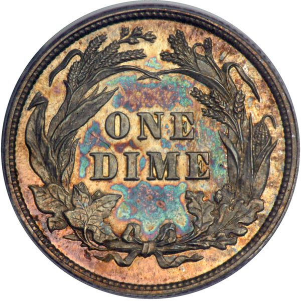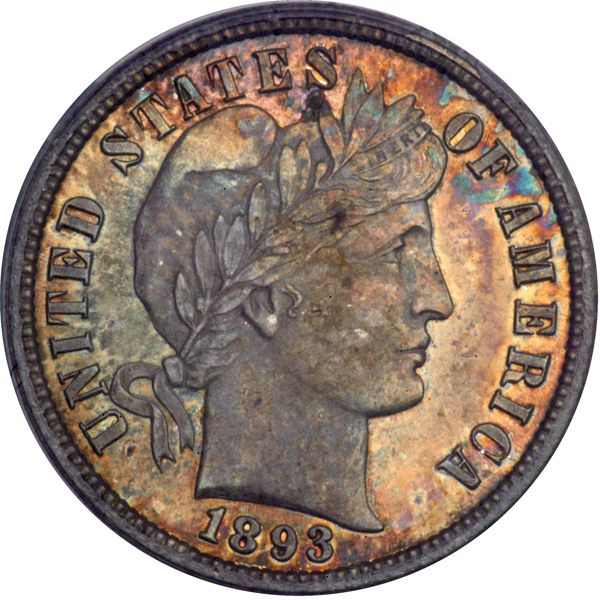 1893 Barber Dime. PCGS graded Proof 65. Only 792 minted. Lovely blue and golden toning points the way to original surfaces and detail aplenty. First-rate Gem in its class (PCGS # 4877) .
