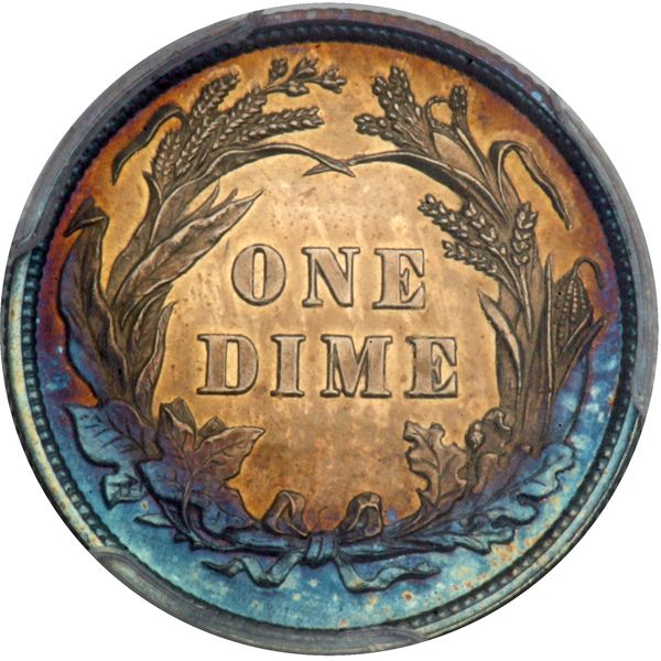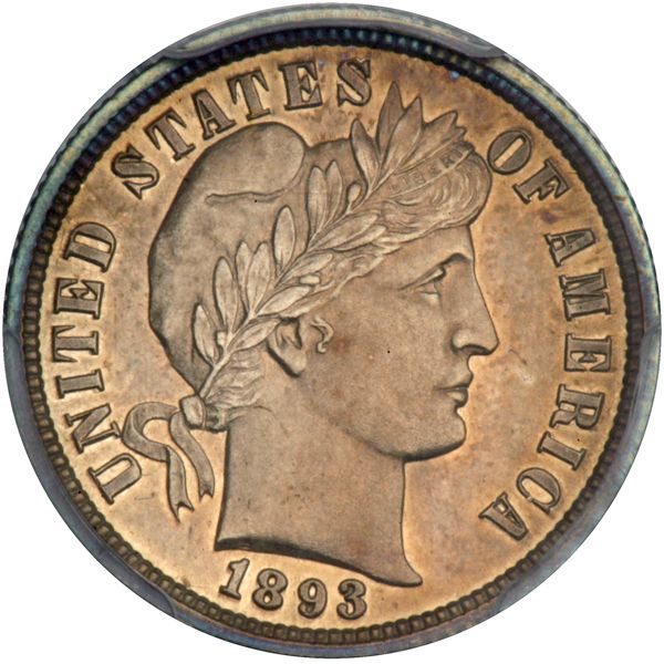 1893 Barber Dime. PCGS graded Proof 64+CAM CAC Approved. Only 792 struck. Lovely golden toning with a crescent of bright blue iridescence on the reverse. Pop 1; 43 finer (PCGS # 84877) .