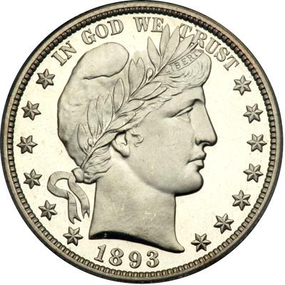 1893 Barber Half Dollar. PCGS graded Proof 66 Deep Cameo. A nice untoned coin. 792 Proofs minted. Frosted glass luster and impressive devices set against sparkling-deep mirrors on both side. If you have ever seen magnesium powder flash by ignition you will be on familiar terms with the blinding white sparkle of this silvery Gem Proof Barber half dollar. Struck with mathematical precision by the dies. Such piercing beauty makes lesser specimens quail or shrink-back in embarassment. Pop 1; 3 finer in 67. (PCGS # 96540).