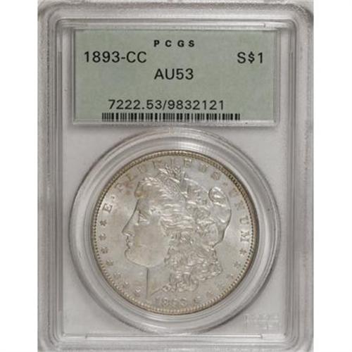 <B>1893-CC $1 AU53 PCGS.</B></I> This semi-key Carson City dollar has plentiful remaining luster, and friction is limited to the central highpoints. There are no remotely mentionable marks. Encased in a green label holder.<BR><BR><B>Coin Engraver:</B> George T. Morgan<BR><BR><b>Shipping:</b> Coins & Currency (<a target="_blank" href="http://www.heritageauctions.com/common/shipping.php">view shipping information</a>)