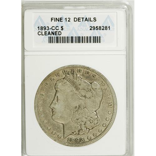<B>1893-CC $1 --Cleaned--ANACS. Fine 12 Details.</B></I> NGC Census: (73/2371). PCGS Population (58/3549). Mintage: 677,000. Numismedia Wsl. Price: $221. (#7222)<BR><BR><b>Shipping:</b> Coins & Currency (<a target="_blank" href="http://www.heritageauctions.com/common/shipping.php">view shipping information</a>)