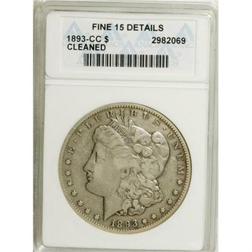 <B>1893-CC $1 --Cleaned--ANACS. Fine 15 Details.</B></I> NGC Census: (40/1829). PCGS Population (62/3426). Mintage: 677,000. Numismedia Wsl. Price for NGC/PCGS coin in F15: $363. (#7222)<BR><BR><b>Shipping:</b> Coins & Currency (<a target="_blank" href="http://www.heritageauctions.com/common/shipping.php">view shipping information</a>)