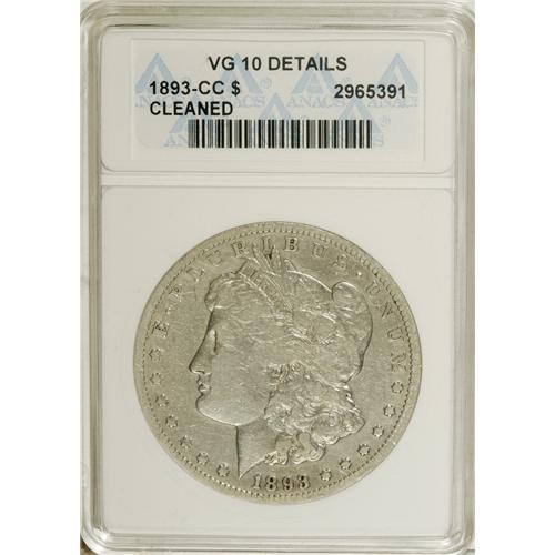 <B>1893-CC $1 --Cleaned--ANACS. VG10 Details.</B></I> NGC Census: (57/2456). PCGS Population (59/3607). Mintage: 677,000. Numismedia Wsl. Price for NGC/PCGS coin in VG10: $194. (#7222)<BR><BR><b>Shipping:</b> Coins & Currency (<a target="_blank" href="http://www.heritageauctions.com/common/shipping.php">view shipping information</a>)