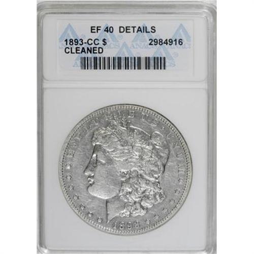 <B>1893-CC $1 --Cleaned--ANACS. XF40 Details.</B></I> This untoned key date Carson City dollar has received a chemical cleaning, but luster glistens from recessed areas, and the designs display much of their initial detail.<BR><BR><b>Shipping:</b> Coins & Currency (<a target="_blank" href="http://www.heritageauctions.com/common/shipping.php">view shipping information</a>)