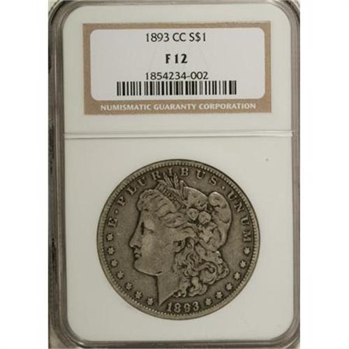 <B>1893-CC $1 F12 NGC.</B></I> NGC Census: (36/1880). PCGS Population (60/3488). Mintage: 677,000. Numismedia Wsl. Price for NGC/PCGS coin in F12: $275. (#7222)<BR><BR><b>Shipping:</b> Coins & Currency (<a target="_blank" href="http://www.heritageauctions.com/common/shipping.php">view shipping information</a>)