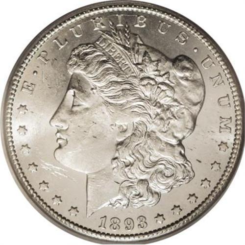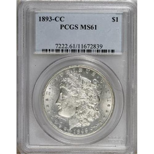 <B>1893-CC $1 MS61 PCGS.</B></I> This bright, highly lustrous example is softly struck over the centers, especially on the obverse. The untoned silver surfaces are nicely preserved on the reverse, but are moderately abraded on the obverse, where heavy bagmarks are noted on Liberty's face and neck, and in the adjoining field area. This was the final year of coin production at the Carson City Mint, and Uncirculated survivors are always in great demand. <BR><BR><b>Shipping:</b> Coins & Currency (<a target="_blank" href="http://www.heritageauctions.com/common/shipping.php">view shipping information</a>)