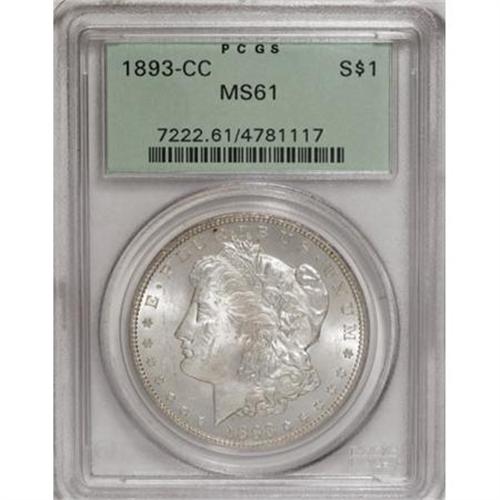 <B>1893-CC $1 MS61 PCGS.</B></I> This brilliant Mint State representative has frosty silver luster with traces of reverse toning. The obverse is noticeably bagmarked, although only a few are significant. The reverse is substantially finer. The 1893-CC and the 1879-CC are similar in overall rarity, and rank just behind the 1889-CC Morgan dollar in terms of elusiveness.<BR><BR><B>Coin Engraver:</B> George T. Morgan<BR><BR><b>Shipping:</b> Coins & Currency (<a target="_blank" href="http://www.heritageauctions.com/common/shipping.php">view shipping information</a>)