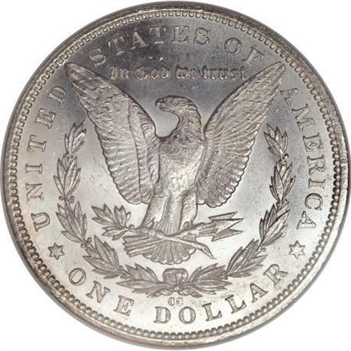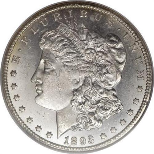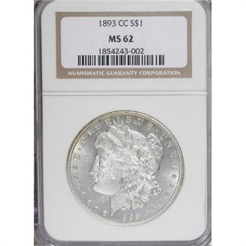 <B>1893-CC $1 MS62 NGC.</B></I> The 1893-CC, with a mintage of 677,000 pieces, is the last of the Carson City dollars. Soft luster issues from bright silvery surfaces that reveal just the faintest hint of light peripheral gold color under magnification. A good strike brings out sharp detail on most of the design elements, except for the usual minor softness in the centers. A handful of obverse marks limit the grade (fortunately, these marks are not as bad as they could be on this extensively bagmarked issue).<BR><BR><B>Coin Engraver:</B> George T. Morgan<BR><BR><b>Shipping:</b> Coins & Currency (<a target="_blank" href="http://www.heritageauctions.com/common/shipping.php">view shipping information</a>\)