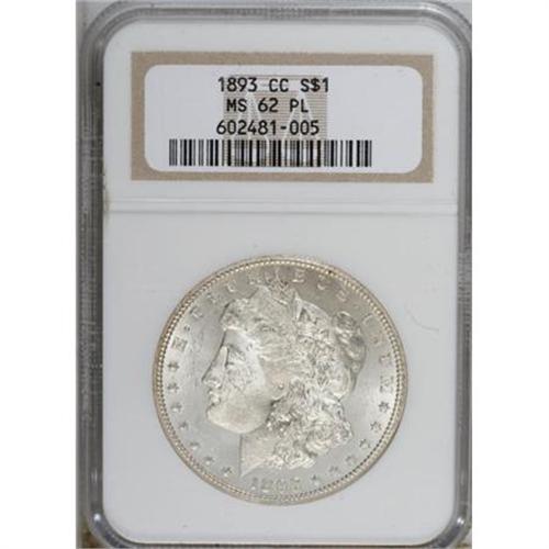 <B>1893-CC $1 MS62 Prooflike NGC.</B></I> This brilliant rare date dollar has flashy fields and a clean reverse. The centers are typically indistinct, while the remainder of the design is sharp. Minor obverse grazes combine to determine the grade. The final year of Carson City production, although the mintmark also appears on certain 1900-O VAMs.<BR><BR><B>Coin Engraver:</B> George T. Morgan<BR><BR><b>Shipping:</b> Coins & Currency (<a target="_blank" href="http://www.heritageauctions.com/common/shipping.php">view shipping information</a>)