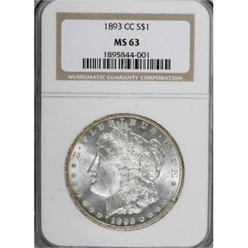 <B>1893-CC $1 MS63 NGC.</B></I> David Bowers (2006) notes of the 667,000-piece 1893-CC dollar that "Probably several hundred thousand (were melted) under the 1918 Pittman Act." Lustrous surfaces abound on this Select example, and reddish-gold patina gravitates to the peripheries, more extensively and deeper on the reverse. Better struck than is typical for the issue, and revealing fewer and less severe bagmarks than typically seen.<BR><BR><B>Coin Engraver:</B> George T. Morgan<BR><BR><b>Shipping:</b> Coins & Currency (<a target="_blank" href="http://www.heritageauctions.com/common/shipping.php">view shipping information</a>)