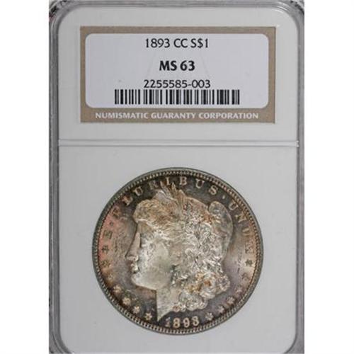<B>1893-CC $1 MS63 NGC.</B></I> The 1893-CC is the last Carson City Mint silver dollar issue. This reddish-gold Select specimen displays semi-prooflike fields that highlight the motifs. Generally well struck, except for the usually soft center areas. The surfaces are more pleasing and better preserved than those of most examples of this heavily bagmarked issue.<BR><BR><B>Coin Engraver:</B> George T. Morgan<BR><BR><b>Shipping:</b> Coins & Currency (<a target="_blank" href="http://www.heritageauctions.com/common/shipping.php">view shipping information</a>)