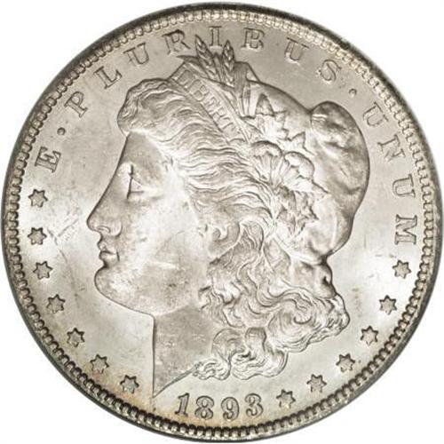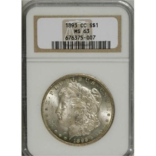 <B>1893-CC $1 MS63 NGC.</B></I> Semiprooflikeness peers through this coin's satiny luster. While the technical grade assigned by NGC is accurate, the eye appeal of this piece is above average for the issue. Light golden toning is evenly dispersed about the surfaces and perhaps the only matter worthy of mention is the typical strike weakness observed at the centers.<BR><BR><B>Coin Engraver:</B> George T. Morgan<BR><BR><b>Shipping:</b> Coins & Currency (<a target="_blank" href="http://www.heritageauctions.com/common/shipping.php">view shipping information</a>)