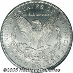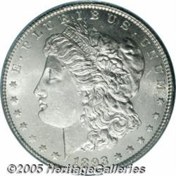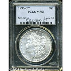<B>1893-CC<img border='0' src='http://www.heritagecoins.com/images/star.gif' width=10 height=10>$1 MS63 PCGS.</B></I> Uncirculated '93-CC Dollars, popular as the final issue from the Carson City Mint, can be divided into strongly struck pieces and flat as a pancake coins. This Select example falls under the category of strongly struck. Both sides exhibit bright cartwheel luster and far less than normally seen marks for the grade.