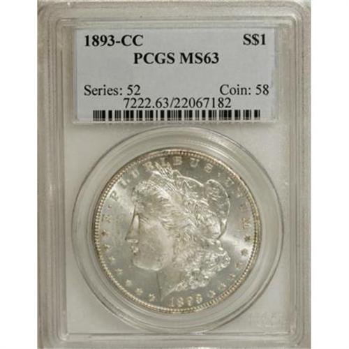 <B>1893-CC $1 MS63 PCGS.</B></I> While not the lowest-mintage issue among Carson City Morgan dollars, a piece such as this generates considerable interest among collectors. The devices are suitably struck, and the highly lustrous fields have only small areas of toning. Numerous minor abrasions on each side account for the grade. <BR><BR><B>Coin Engraver:</B> George T. Morgan<BR><BR><b>Shipping:</b> Coins & Currency (<a target="_blank" href="http://www.heritageauctions.com/common/shipping.php">view shipping information</a>\)