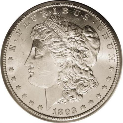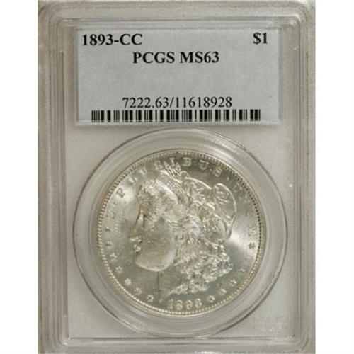 <B>1893-CC $1 MS63 PCGS.</B></I> The last of the renowned trio of CC-mint Morgan key dates along with the 1889-CC and '79-CC, the 1893-CC is also the last silver dollar made at the Carson City Mint--although the last to bear a CC mintmark is the 1900-O/CC! This silver-white piece shows just a few light obverse scuffs that preclude a finer grade. The reverse is fairly prooflike. A nice coin for the grade.<BR><BR><B>Coin Engraver:</B> George T. Morgan<BR><BR><b>Shipping:</b> Coins & Currency (<a target="_blank" href="http://www.heritageauctions.com/common/shipping.php">view shipping information</a>\)