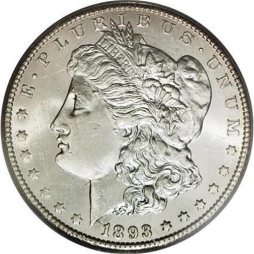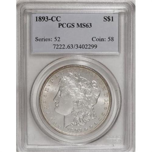 <B>1893-CC $1 MS63 PCGS.</B></I> David Bowers (2007) writes of the 1893-CC: "A piece MS63 or finer, with minimum bagmarks, is a numismatic find and is very special. Discount poor strikes and 'baggy' coins, and you'll find that remaining pieces in the marketplace are few and far between." And indeed the current Select specimen is special! It is sharply struck with pleasing luster, and just a few inoffensive contacts. Both sides are essentially untoned.<BR><BR><B>Coin Engraver:</B> George T. Morgan<BR><BR><b>Shipping:</b> Coins & Currency (<a target="_blank" href="http://www.heritageauctions.com/common/shipping.php">view shipping information</a>)