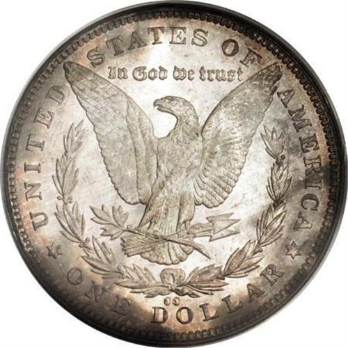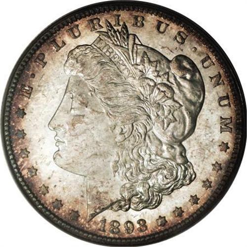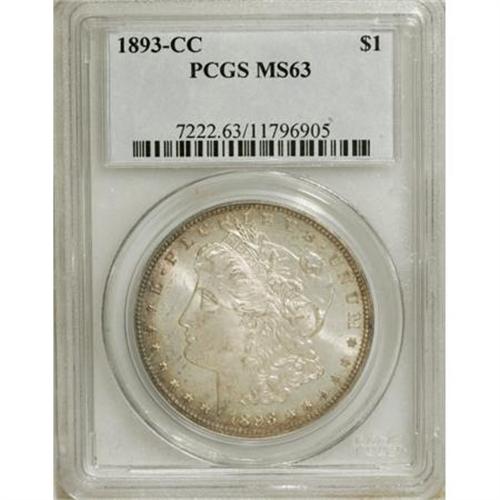 <B>1893-CC $1 MS63 PCGS.</B></I> Golden-brown and plum-red enrich the obverse margin. The reverse is almond-gold with blushes of dusky steel-gray. Lustrous and original with clean fields and a few inconspicuous facial marks. The strike is intricate by the standards of the 1893-CC, which is often seen with soft centers.<BR><BR><B>Coin Engraver:</B> George T. Morgan<BR><BR><b>Shipping:</b> Coins & Currency (<a target="_blank" href="http://www.heritageauctions.com/common/shipping.php">view shipping information</a>)