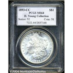 <table><tbody><tr><td><table> <TR><TD width="100%"><TABLE cellSpacing=1 cellPadding=3 width="100%" border=0><TBODY><TR><TD width="100%" bgColor=#79735c><FONT face=arial color=#ffffff size=3><B>Description</B> </FONT></TD></TR><TR><TD width="100%" bgColor=#ffffff><FONT face=arial size=2><B>1893-CC $1 MS64 PCGS.</B></I> Ex: D. Young Collection. A bright, untoned representative, arguably the finest of several Mint State '93-CC Dollars in the sale, with bold central details and just a few grade-limiting field marks on the obverse. </FONT></TD></TR></TBODY></TABLE></TD></TR></TBODY></TABLE><BR><A name=PricesRealized></A><TABLE cellSpacing=0 cellPadding=0 width="100%" bgColor=#000000 border=0><TBODY><TR><TD width="100%"><TABLE cellSpacing=1 cellPadding=3 width="100%" border=0><TBODY><TR><TD width="100%" bgColor=#79735c><A name=PR><FONT face=arial color=#ffffff size=3><B>Previous Prices from Heritage Auctions</B> </FONT></A></TD></TR><TR><TD bgColor=#f6f6ed><TABLE cellSpacing=0 cellPadding=0 width="100%" border=1><TBODY><TR><TD align=middle width="33%"><B>Date</B></TD><TD align=middle width="33%"><B>Service</B></TD><TD align=middle width="33%"><B>Price</B></TD></TR><TR bgColor=whitesmoke><TD width="33%"><B>10/08/2002</B></TD><TD width="33%">PCGS</TD><TD width="33%">$5,635.00</TD></TR><TR bgColor=whitesmoke><TD width="33%"><B>01/07/2004</B></TD><TD width="33%">PCGS</TD><TD width="33%">$10,120.00</TD></TR><TR bgColor=whitesmoke><TD width="33%"><B>09/20/2003</B></TD><TD width="33%">NGC</TD><TD width="33%">$6,210.00</TD></TR><TR bgColor=whitesmoke><TD width="33%"><B>07/29/2003</B></TD><TD width="33%">PCGS</TD><TD width="33%">$7,475.00</TD></TR><TR bgColor=whitesmoke><TD width="33%"><B>07/30/2002</B></TD><TD width="33%">PCGS</TD><TD width="33%">$5,290.00</TD></TR><TR bgColor=whitesmoke><TD width="33%"><B>04/27/2002</B></TD><TD width="33%">PCGS</TD><TD width="33%">$5,175.00</TD></TR><TR bgColor=whitesmoke><TD width="33%"><B>01/12/2002</B></TD><TD width="33%">PCGS</TD><TD width="33%">$5,175.00</TD></TR><TR bgColor=whitesmoke><TD width="33%"><B>10/06/2001</B></TD><TD width="33%">PCGS</TD><TD width="33%">$4,830.00</TD></TR><TR bgColor=whitesmoke><TD width="33%"><B>01/05/2001</B></TD><TD width="33%">PCGS</TD><TD width="33%">$4,830.00</TD></TR><TR bgColor=whitesmoke><TD width="33%"><B>06/10/2000</B></TD><TD width="33%">PCGS</TD><TD width="33%">$5,060.00</TD></TR><TR bgColor=whitesmoke><TD width="33%"><B>08/13/1999</B></TD><TD width="33%">PCGS</TD><TD width="33%">$6,037.50</TD></TR><TR bgColor=whitesmoke><TD width="33%"><B>04/23/1999</B></TD><TD width="33%">PCGS</TD><TD width="33%">$7,820.00</TD></TR><TR bgColor=whitesmoke><TD width="33%"><B>09/13/1997</B></TD><TD width="33%">PCGS</TD><TD width="33%">$6,210.00</TD></TR><TR bgColor=whitesmoke><TD width="33%"><B>03/04/1995</B></TD><TD width="33%">PCGS</TD><TD width="33%">$5,500.00</TD></TR><TR bgColor=whitesmoke><TD width="33%"><B>10/16/2001</B></TD><TD width="33%">PCGS</TD><TD width="33%">$6,038.00</TD></TR><TR bgColor=whitesmoke><TD width="33%"><B>10/01/2001</B></TD><TD width="33%">PCGS</TD><TD width="33%">$5,405.00</TD></TR><TR bgColor=whitesmoke><TD width="33%"><B>09/01/1999</B></TD><TD width="33%">PCGS</TD><TD width="33%">$6,670.00</TD></TR><TR bgColor=whitesmoke><TD width="33%"><B>04/01/1999</B></TD><TD width="33%">PCGS</TD><TD width="33%">$9,900.00</TD></TR><TR bgColor=whitesmoke><TD width="33%"><B>07/01/1997</B></TD><TD width="33%">PCGS</TD><TD width="33%">$7,260.00</TD></TR></TBODY></TABLE></TD></TR><TR><TD bgColor=#ffffff><FONT face=arial size=1 ?>PLEASE NOTE: All prices realized reflect the final hammer price PLUS the buyer's premium in auctions that charge a buyer's premium. Each item has a notation at the top of the listing indicating whether that lot included a buyer's premium. Example: A item that sells with a final hammer price of $100 and a 20% buyer's premium will display with a price realized of $120. All information listed is intended to be as accurate as possible, but errors are possible. Please use this guide carefully and inform us of any inaccuracies. </FONT></TD></TR></TBODY></TABLE></TD></TR></TBODY></TABLE><BR><TABLE cellSpacing=0 cellPadding=0 width="100%" bgColor=#000000 border=0><TBODY><TR><TD width="100%"><TABLE cellSpacing=1 cellPadding=3 width="100%" border=0><TBODY><TR><TD width="100%" bgColor=#79735c colSpan=6><FONT face=arial color=#ffffff size=3><B>Price Guide*</B> </FONT></TD></TR><TR bgColor=#f6f6ed><TD align=middle><B>Grade</B> </TD><TD align=middle><B>Coin World<BR>(Trends)</B> </TD><TD align=middle><B>Numismedia<BR>Retail</B> </TD><TD align=middle><B>Numismedia<BR>Wholesale</B> </TD><TD align=middle><B>Coin<BR>Universe</B> </TD><TD align=middle><B>Heritage<BR>Value Index</B> </TD></TR><TR bgColor=#ffffff><TD align=middle>63</TD><TD align=right>$4,500.00</TD><TD align=right>---</TD><TD align=right>$3,575.00</TD><TD align=right>$4,150.00</TD><TD align=right>$3,396.25</TD></TR><TR style="FONT-WEIGHT: bold" bgColor=#cccfdd><TD align=middle>64</TD><TD align=right>$8,500.00</TD><TD align=right>---</TD><TD align=right>$6,975.00</TD><TD align=right>$8,000.00</TD><TD align=right>$6,286.25</TD></TR><TR bgColor=#ffffff><TD align=middle>65</TD><TD align=right>$50,000.00</TD><TD align=right>---</TD><TD align=right>$39,500.00</TD><TD align=right>$48,000.00</TD><TD align=right>$34,925.00</TD></TR><TR bgColor=#ffffff><TD colSpan=6><FONT size=1>*All information listed is intended to be as accurate as possible, but errors are possible. No item may be returned or refused based on this information which is provided as a service to our customers. You should contact each pricing source directly to determine the accuracy of this information. </FONT></TD></TR></TBODY></TABLE></TD></TR></TBODY></TABLE><BR><TABLE cellSpacing=0 cellPadding=0 width="100%" bgColor=#000000 border=0><TBODY><TR><TD width="100%"><TABLE cellSpacing=1 cellPadding=3 width="100%" border=0><TBODY><TR><TD width="100%" bgColor=#79735c><FONT face=arial color=#ffffff size=3>