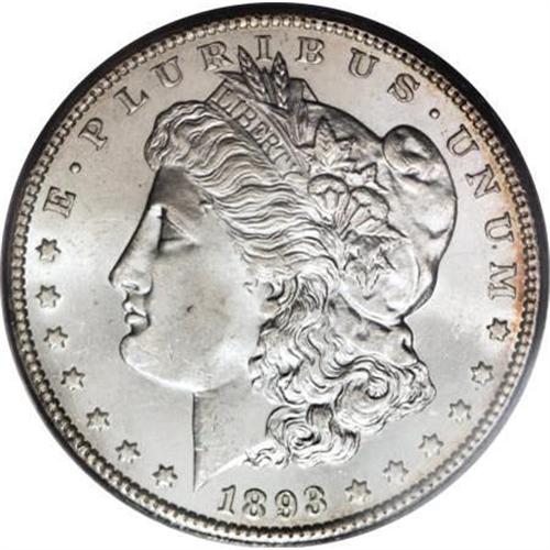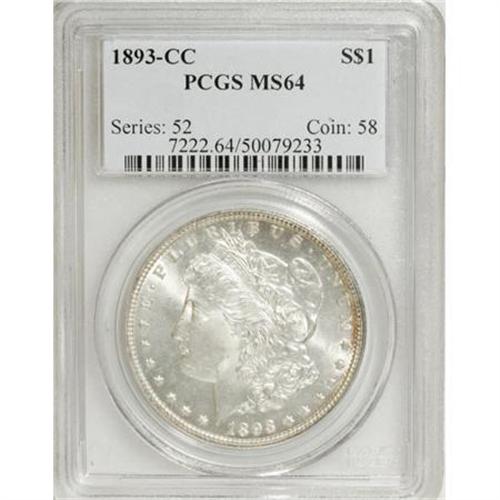 <B>1893-CC $1 MS64 PCGS.</B></I> An incredibly strong (i.e., full) strike is one of the first things the viewer notices about this coin. That and the remarkably clean surfaces--both of which are atypical for the issue. The surfaces are clean throughout and one can safely say upper-end for the grade. The only deterrent to a Gem grade is a sideways V-shaped mark on the chin of Liberty. Bright mint luster and brilliant except for a slight accent of peripheral golden color.<BR><I>From The Jimmy G. PCGS Registry Collection of Morgan Dollars with Varieties.</B></I><BR><BR><B>Coin Engraver:</B> George T. Morgan<BR><BR><b>Shipping:</b> Coins & Currency (<a target="_blank" href="http://www.heritageauctions.com/common/shipping.php">view shipping information</a>)