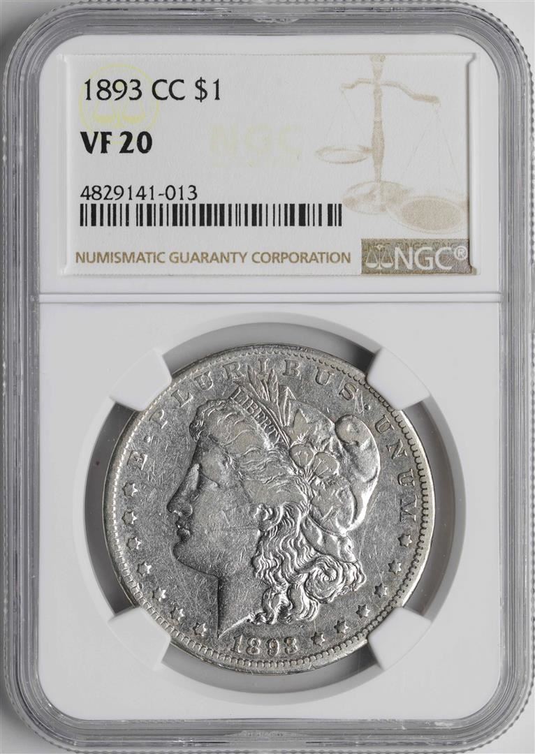One 1893-CC $1 Morgan Silver Dollar Coin NGC VF20. NGC Certified.