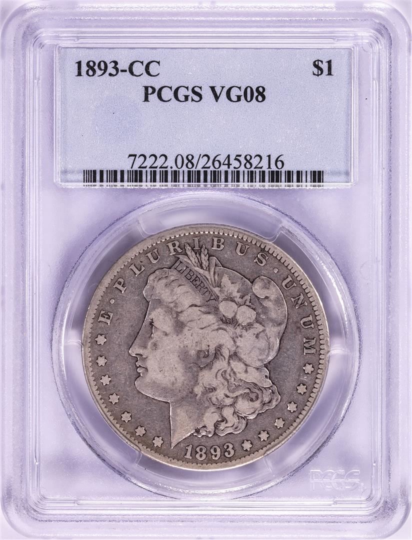 One 1893-CC $1 Morgan Silver Dollar Coin PCGS VG08. PCGS Graded.