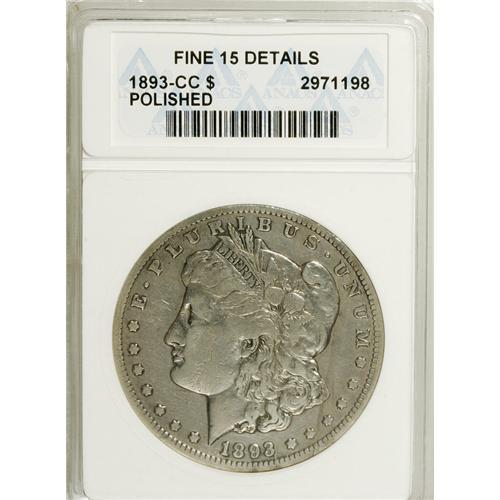 <B>1893-CC $1 --Polished--ANACS. Fine 15 Details.</B></I> NGC Census: (41/1817). PCGS Population (62/3428). Mintage: 677,000. Numismedia Wsl. Price for NGC/PCGS coin in F15: $309. (#7222)<BR><BR><b>Shipping:</b> Coins & Currency (<a target="_blank" href="http://www.heritageauctions.com/common/shipping.php">view shipping information</a>)