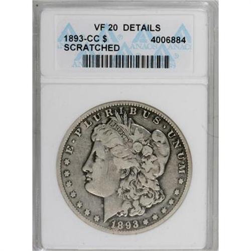<B>1893-CC $1 --Scratched--ANACS. VF20 Details.</B></I> NGC Census: (55/1822). PCGS Population (69/3482). Mintage: 677,000. Numismedia Wsl. Price for NGC/PCGS coin in VF20: $525. (#7222)<BR><BR><B>Coin Engraver:</B> George T. Morgan<BR><BR><b>Shipping:</b> Coins & Currency (<a target="_blank" href="http://www.heritageauctions.com/common/shipping.php">view shipping information</a>)