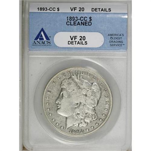 <B>1893-CC $1 --Cleaned--ANACS. VF20 Details.</B></I> NGC Census: (59/1853). PCGS Population (73/3538). Mintage: 677,000. Numismedia Wsl. Price for NGC/PCGS coin in VF20: $525. (#7222)<BR><BR><B>Coin Engraver:</B> George T. Morgan<BR><BR><b>Shipping:</b> Coins & Currency (<a target="_blank" href="http://www.heritageauctions.com/common/shipping.php">view shipping information</a>)
