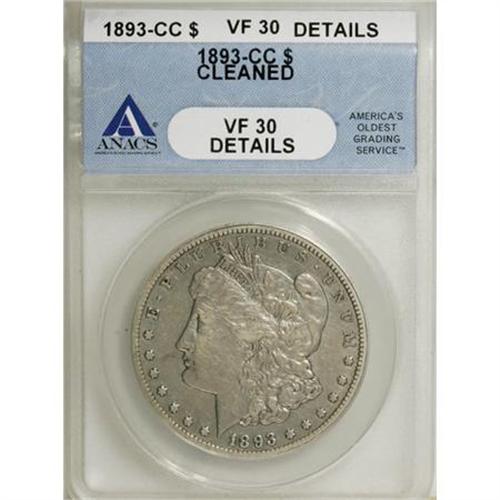 <B>1893-CC $1 --Cleaned--ANACS VF30 Details.</B></I> NGC Census: (84/1735). PCGS Population (98/3467). Mintage: 677,000. Numismedia Wsl. Price for NGC/PCGS coin in VF30: $855. (#7222)<BR><BR><B>Coin Engraver:</B> George T. Morgan<BR><BR><b>Shipping:</b> Coins & Currency (<a target="_blank" href="http://www.heritageauctions.com/common/shipping.php">view shipping information</a>)