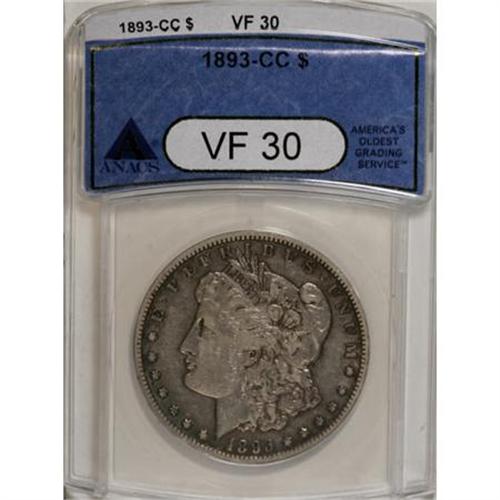 <B>1893-CC $1 VF30 ANACS.</B></I> A moderately worn representative of this lower-mintage final-year Carson City issue, predominantly cloud-gray with reddish-orange patina at the margins. Well struck with a number of abrasions on the cheek.<BR><BR><B>Coin Engraver:</B> George T. Morgan<BR><BR><b>Shipping:</b> Coins & Currency (<a target="_blank" href="http://www.heritageauctions.com/common/shipping.php">view shipping information</a>)
