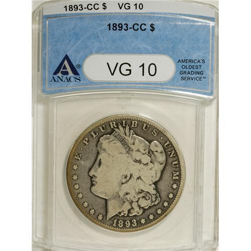 <B>1893-CC $1 VG10 ANACS.</B></I> NGC Census: (56/2416). PCGS Population (59/3607). Mintage: 677,000. Numismedia Wsl. Price: $194. (#7222)<BR><BR><b>Shipping:</b> Coin/Currency (<a target="_blank" href="http://www.heritageauctions.com/common/shipping.php">view shipping information</a>)