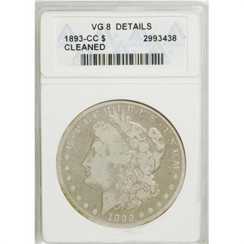 <B>1893-CC $1 --Cleaned--ANACS. VG8 Details.</B></I> NGC Census: (33/1973). PCGS Population (51/3702). Mintage: 677,000. Numismedia Wsl. Price for NGC/PCGS coin in VG8 : $220. (#7222)<BR><BR><B>Coin Engraver:</B> George T. Morgan<BR><BR><b>Shipping:</b> Coins & Currency (<a target="_blank" href="http://www.heritageauctions.com/common/shipping.php">view shipping information</a>)