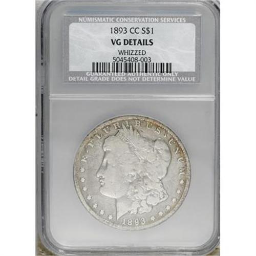 <B>1893-CC $1 --Whizzed--NCS. VG Details.</B></I> NGC Census: (36/2032). PCGS Population (53/3845). Mintage: 677,000. Numismedia Wsl. Price for NGC/PCGS coin in VG8 : $220. (#7222)<BR><BR><B>Coin Engraver:</B> George T. Morgan<BR><BR><b>Shipping:</b> Coins & Currency (<a target="_blank" href="http://www.heritageauctions.com/common/shipping.php">view shipping information</a>)