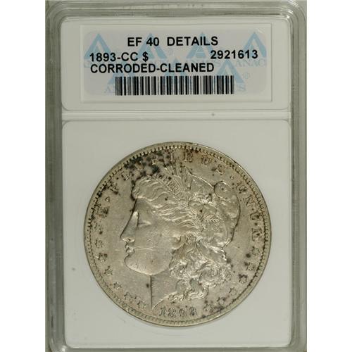 <B>1893-CC $1 --Corroded, Cleaned--ANACS. XF40 Details.</B></I> NGC Census: (90/1471). PCGS Population (105/3085). Mintage: 677,000. Numismedia Wsl. Price for NGC/PCGS coin in XF40: $1,300. (#7222)<BR><BR><b>Shipping:</b> Coin/Currency (<a target="_blank" href="http://www.heritageauctions.com/common/shipping.php">view shipping information</a>)