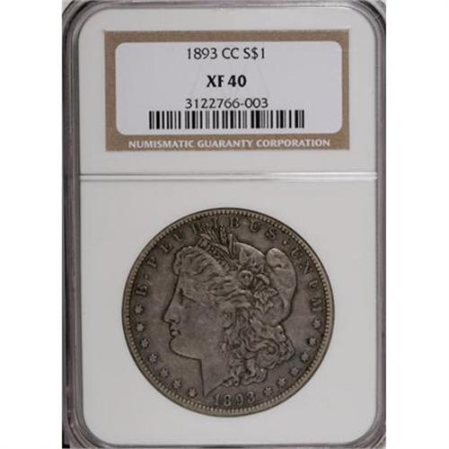 <B>1893-CC $1 XF40 NGC.</B></I> A blend of pink and silver-gray patina drapes each side of this minimally marked XF piece. A great representative from the last year of the Carson City Mint, well struck with subtly luminous fields.<BR><BR><B>Coin Engraver:</B> George T. Morgan<BR><BR><b>Shipping:</b> Coins & Currency (<a target="_blank" href="http://www.heritageauctions.com/common/shipping.php">view shipping information</a>)