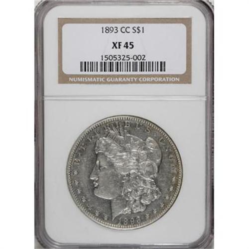 <B>1893-CC $1 XF45 NGC.</B></I> The luminous surfaces of this Choice XF piece are predominantly light silver-gray with a hint of gold at the obverse rim and a band of peach and violet at the upper reverse. Well struck with faint, scattered abrasions. Overall, an appealing, lightly circulated example of this noted issue.<BR><BR><B>Coin Engraver:</B> George T. Morgan<BR><BR><b>Shipping:</b> Coins & Currency (<a target="_blank" href="http://www.heritageauctions.com/common/shipping.php">view shipping information</a>)
