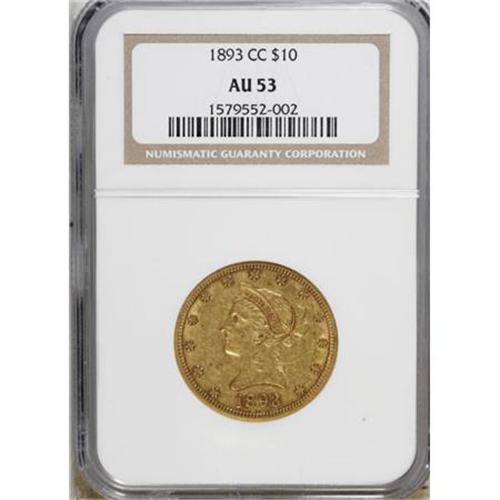<B>1893-CC $10 AU53 NGC.</B></I> A surprisingly well detailed example, for the grade, this piece also exhibits noticeable bits of luster, especially near the peripheral devices. Moderately worn across the highpoints with just a few small, scattered abrasions on each side. According to Garrett and Guth (2006): "The 1893-CC is an inexplicable rarity and is much more difficult to find than any other Carson City eagle from this decade." <BR><BR><B>Coin Engraver:</B> Christian Gobrecht<BR><BR><b>Shipping:</b> Coins & Currency (<a target="_blank" href="http://www.heritageauctions.com/common/shipping.php">view shipping information</a>)