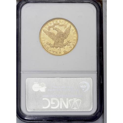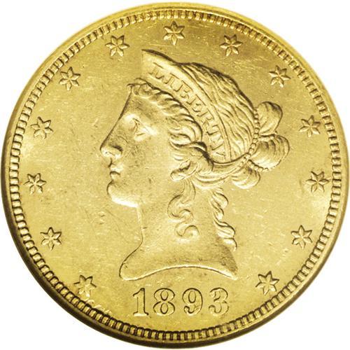 <B>1893-CC<$10> Prooflike AU58 NGC.</B></I> Bright and slightly reflective in the fields, with delicate coppery-gold adhering near the devices. Fully struck and well preserved, with just a few minor scattered ticks from brief circulation. Apparently an early die strike as the fields retain much more reflectivity than normally seen. Final year of issue before the Carson City Mint was closed by Grover Cleveland, who felt this Western mint was unnecessary with the San Francisco Mint so close by. Difficult to find with the prooflike surfaces, particularly so in high grade. Census: 33 in 58, 8 finer (3/06). <BR><BR><B>Important notice:</B> Heritage usually auctions material at the rate of 200-250 lots per hour. On some occasions eBay Live bid software or the Internet may not be able to keep up with the pace of the auction. We recommend placing a realistic absentee bid now as insurance to avoid disappointment. Occasionally the auctioneer may eliminate or reject an eBay Live bid, and the auctioneer may also reopen a lot after the close of the eBay live bidding (usually because we missed an audience bid), and may reject your bid even if it shows you as the winning bidder. By bidding via eBay Live, you agree that Heritage may award the lot to another bidder at its sole discretion under the circumstances described above or any other reasonable circumstances. Since eBay bids are not shown to us until we open the lot on the floor, we treat those bids just like floor bids. In most cases the floor responds before the eBay bid is presented to us, due to Internet lag time, so for consistency we have made it a policy that floor bids are always considered first over tie eBay live bids. Also please note that all Heritage lots purchased through eBay Live carry a 20% Buyer's Premium. Please make sure you read the Terms and Conditions before you bid. This lot is being auctioned in conjunction with a live floor auction by Heritage Galleries & Auctioneers. All final auction and invoice information will be supplied by Heritage Galleries & Auctioneers, and all other information should be considered preliminary. Lot:4041 <BR><BR><B>Winning Notification and Billing:</B> After the FINAL session in this auction is complete, Heritage will send e-mail and snail mail invoices. This process normally takes several days. All final auction and invoice information will be supplied by Heritage Galleries & Auctioneers, and all other information should be considered preliminary. <BR><BR>This auction will be conducted on a live auction floor and over the Internet through eBay Live. If you choose to place an absentee bid, please take a moment to <font color='#0000ff'><u><a href='http://pages.ebay.com/liveauctions/help/before/laabsentee.html'>learn how eBay Live absentee bidding works</a></u></font><font color='#000000'>