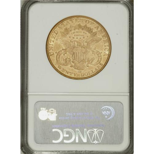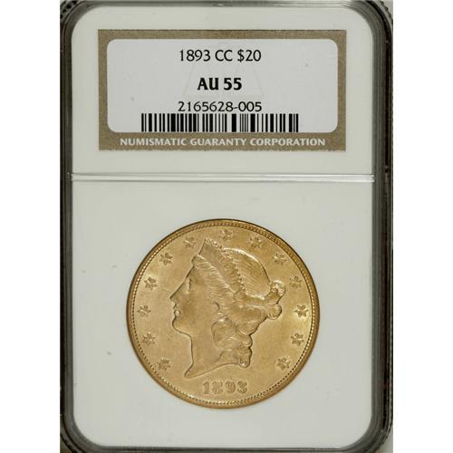 <B>1893-CC $20 AU55 NGC.</B></I> Rusty Goe writes in <I>The Mint on Carson Street,</B></I> "Whether or not the coiner ... knew that 1893 would be the finale of CC-mint coinage production is debatable. What is evident from the surviving population of 1893-CC double eagles is that the workers put forth extra effort to produce the highest quality coins possible and collectors today can thank them for this. When beholding just about any problem free 1893-CC in AU or above, one can see the superiority of the strike, luster and color." This phenomenally beautiful coin is certainly a graphic demonstration of those higher aesthetics, displaying as it does nearly mark-free apricot-gold surfaces with considerable prooflikeness in evidence, a bold strike, and radiant luster. Incredibly high-end for the grade.<BR><BR><b>Shipping:</b> Coins & Currency (<a target="_blank" href="http://www.heritageauctions.com/common/shipping.php">view shipping information</a>)